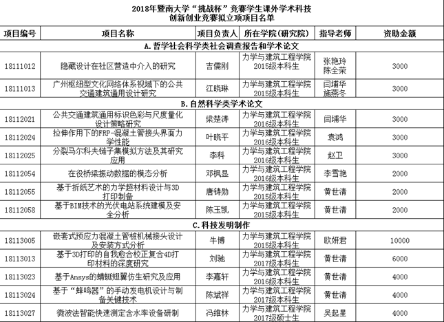 根据《bat365在线平台登录关于开展2018年“挑战杯”等学生课外学术科技创新创业竞赛项目立项申报工作的通知》(暨通【2017】41号)的要求,经过团队申报、所在学院审核、学校学生课外学术科技创新创业竞赛活动专家指导和评审委员会遵循“公平、公开、公正、择优、诚信”的原则,从科学性、先进性、现实意义及参赛潜力等诸多方面进行评审后,我院申请的36个“挑战杯”项目获批13项。现将立项项目和资助金额公布如下: