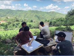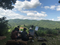 7月20日,旅途并未停歇,第二日的目的地便是雁南飞。极目远望,漫山遍野却是茶香盎然。浓浓的绿色泼于山口,倒让人想起“赌书消得泼茶香”的闲情雅致。行步于茶树间,人的心情也愈发平静淡然。师生在其中信步而行,静坐、闲谈,用手中的画笔,临摹下那属于茶的万水千山。至太阳将斜,方如倦鸟归林,带着疲惫与收获回到住处,师生互相分享自己一天的收获,其乐融融。