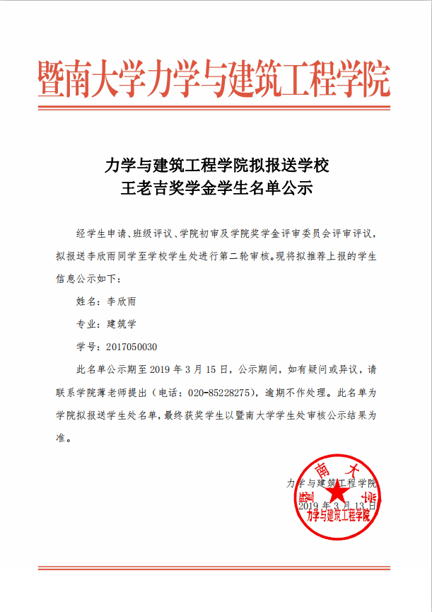 bat365在线平台登录拟报送学校王老吉奖学金学生名单公示