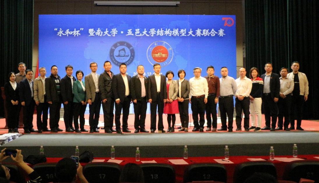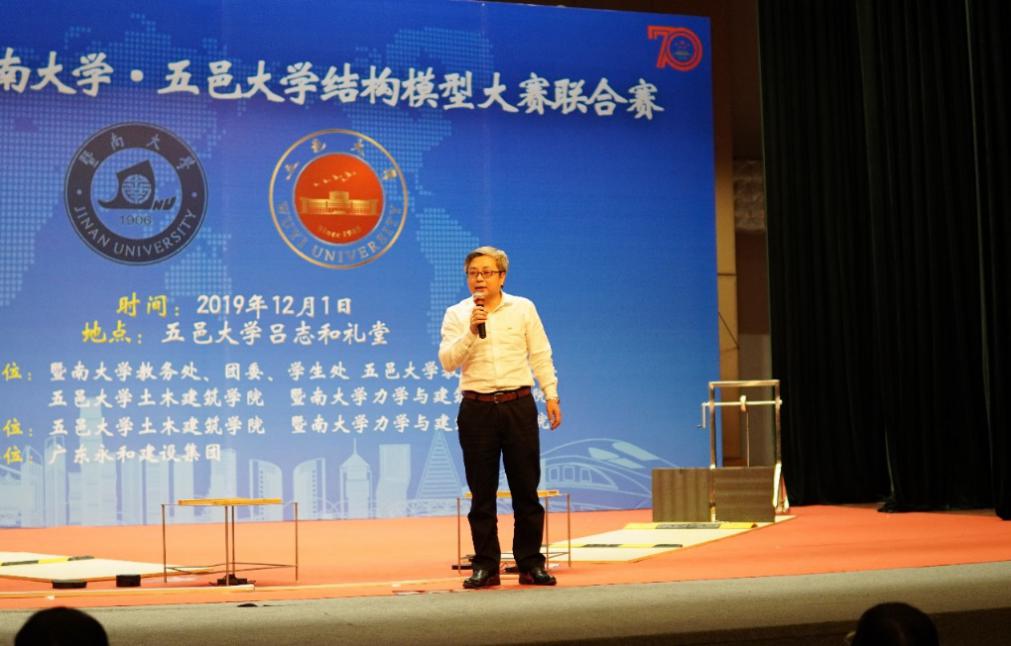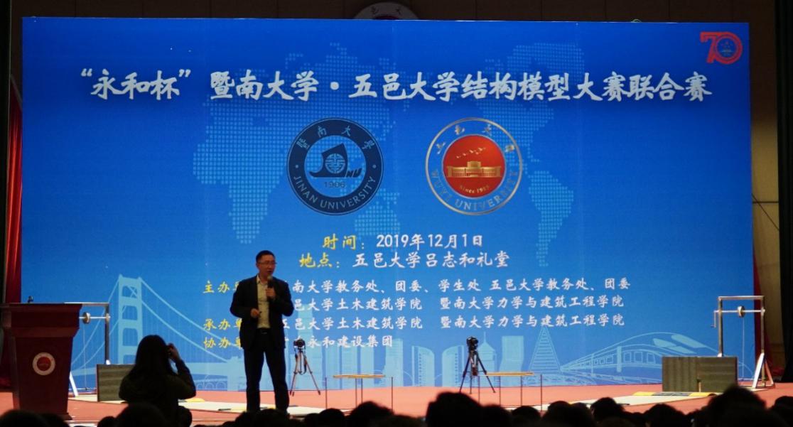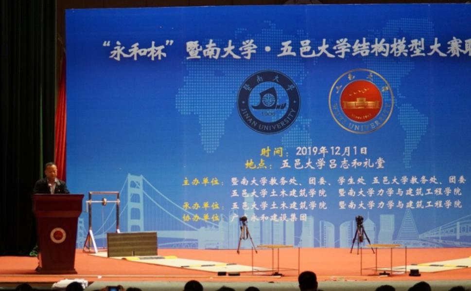 为深入贯彻广东省委组织部和省委教育工委精细部署开展的高校教育人才“组团式”帮扶政策精神,12月1日,由bat365在线平台登录教务处、团委、学生处、bat365在线平台登录和五邑大学教务处、团委、土木建筑学院联合主办,广东永和建设集团协办的2019年“永和杯”bat365在线平台登录·五邑大学结构模型大赛联合赛于五邑大学吕志和礼堂隆重举行。bat365在线平台登录副校长张宏,五邑大学副校长董超俊,五邑大学校长助理、bat365在线平台登录驻五邑大学帮扶团队队长李爱梅,永和建设集团副董事长兼总裁何明理先生,bat365在线平台登录党委书记黄睿、网络与教育技术中心主任张焕明、教务处副处长张晓宁、研究生院副院长陈光慧、理工学院党委副书记田金奎、药学院副院长周光雄、bat365在线平台登录副院长黄世清,五邑大学教务处处长纪秋颖、土木建筑学院院长周利、土木建筑学院党总支书记吴卓强受邀出席。本次大赛由五邑大学土木建筑学院副院长、bat365在线平台登录驻五邑大学帮扶团队成员、bat365在线平台登录聂振华副教授担任技术总指导,邀请了来自bat365在线平台登录、五邑大学与东莞理工学院的7位专家担任评委。同时,来自bat365在线平台登录和五邑大学各个部处、学院的老师们也莅临本次比赛。