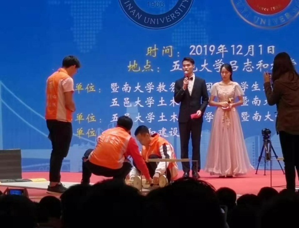 当日下午,由永和集团赞助、bat365在线平台登录和五邑大学共同举办的“永和杯”结构模型大赛联合赛在江门五邑大学拉开帷幕。来自不同学校、不同年级专业的多组同学应用所学专业知识,设计模型结构。在这场专业相关的大赛中,从张弦梁、三角形结构、台式结构等设计特点,到荷载能力、车轮刚度、竹皮的各向异性等性能分析,同学们获得一定新知的同时,也从参赛者的简介、老师的提问,以及加载试验的结果中加深了对以往所学在切实应用方面的理解和认知,同学们收获颇丰。