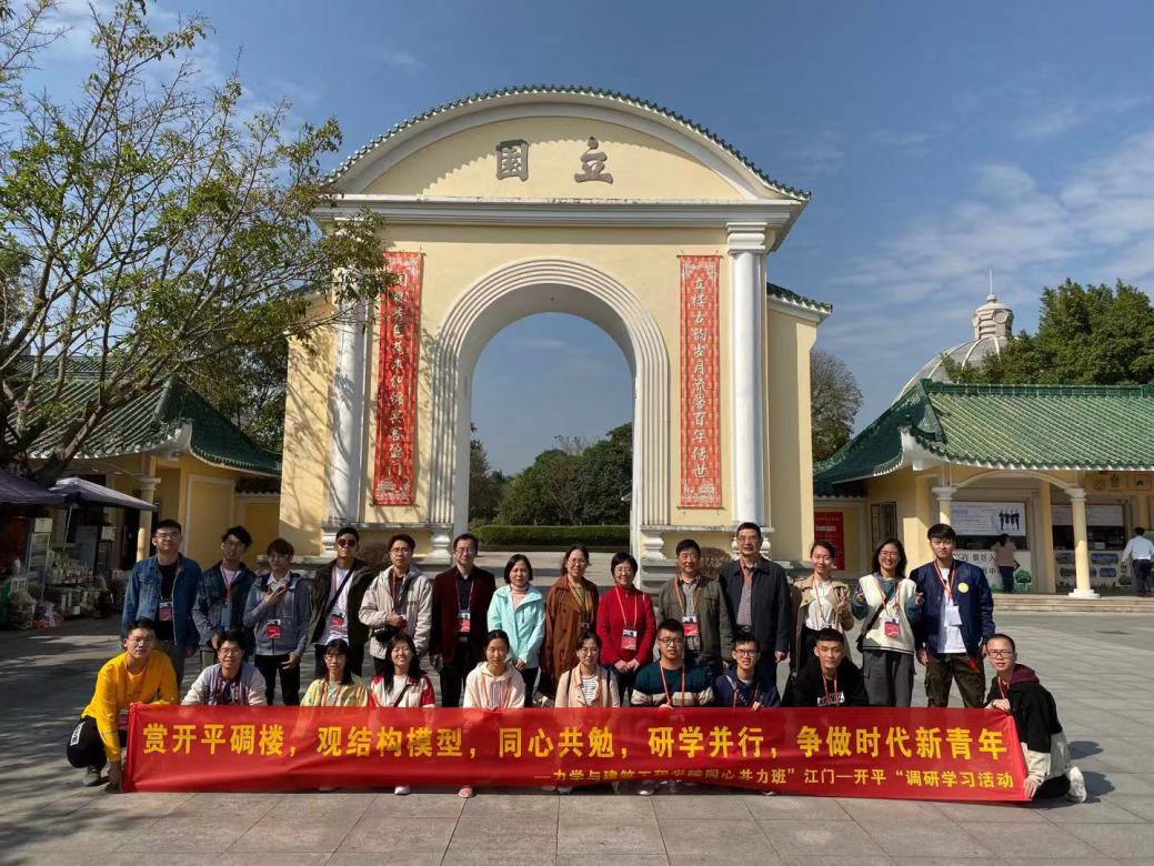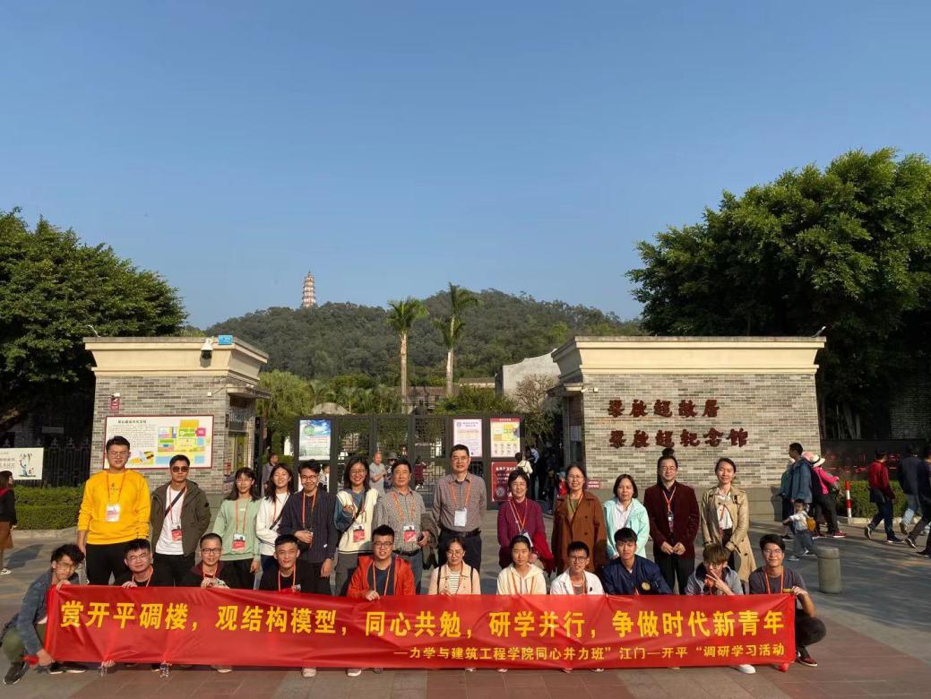 江门市辖蓬江、江海、新会三区及台山、开平、鹤山、恩平四个县级市,辖区范围俗称“五邑”。共同的历史,同出一宗的地缘人缘,加上海外对五邑的影响,使江门五邑展现出丰富的民俗风情,又有“中国第一侨乡”之美誉。11月30日至12月1日,同心并力班师生一行人开展了为期两天的研学实践活动。学院党委书记、同心并力班班主任黄睿,学院副院长、同心并力班副班主任黄世清、同心并力班导师郭幸福、王璠、余岭、欧妍君、王波、吴起星、曾岚、唐启红、何紫珊、薄冬营带队前往。通过为期两天的社会实践活动,同感受祖国大地的风土人情,考察江门市当地标志性建筑,观摩结构模型大赛,提升家国情怀、人文情怀和专业素养。