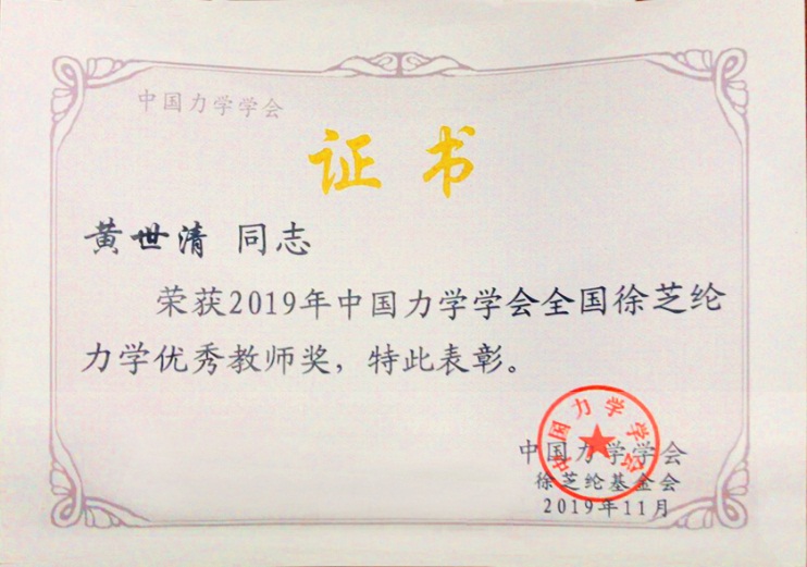 经全国各省(市、自治区)力学学会推荐、专家组评审、中国力学学会教育工作委员会讨论决定,近日揭晓了“2019年中国力学学会全国徐芝纶优秀教师奖”评选结果。bat365在线平台登录黄世清副教授获此殊荣。