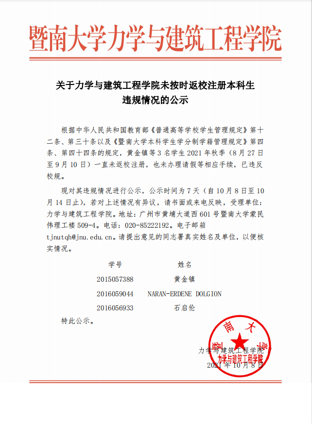 关于bat365在线平台登录未按时返校注册本科生违规情况的公示