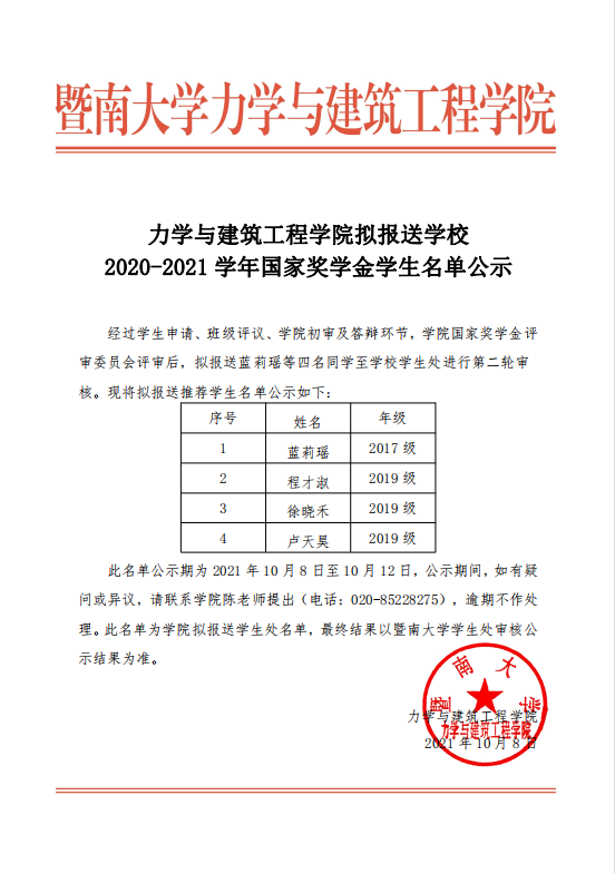 bat365在线平台登录拟报送学校2020-2021学年国家奖学金学生名单公示