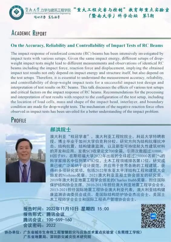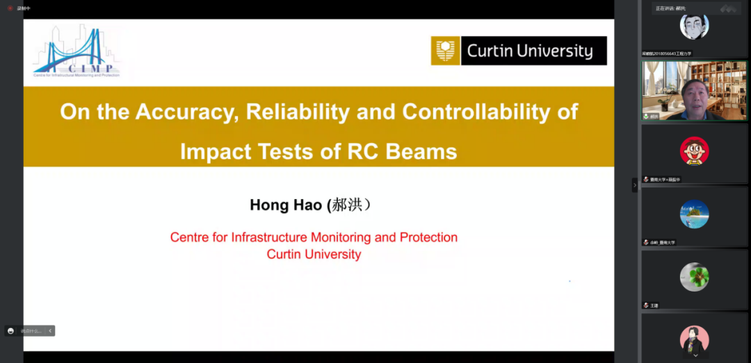 2022年11月10日下午,“重大工程灾害与控制”教育部重点实验室(bat365在线平台登录)科学论坛第1期在线上成功举办,此次论坛邀请到澳大利亚“桂冠学者”郝洪院士作题为“On the Accuracy, Reliability and Controllability of Impact Tests of RC Beams”的特邀报告,bat365在线平台登录及国内其他高校的师生学者300余人参加论坛。本次论坛由学院主持工作副院长兼党委副书记聂振华教授主持。
