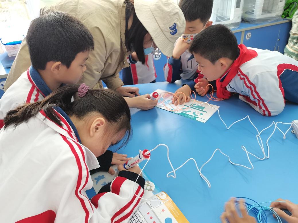 同时,志愿者们协助有基础的高年级同学将电路知识与3d打印技术相结合进行创新设计,同学们发挥自己的想像,畅想自己的设计方案,在使用3D打印笔进行模型制作时,志愿者们充当同学们的小帮手,引导同学们完善作品,最终实现大家的设计,虽然过程不是一帆风顺,但经过志愿者和同学们的不懈努力,大家在克服困难与不断创造之中收获了成就与欣喜。