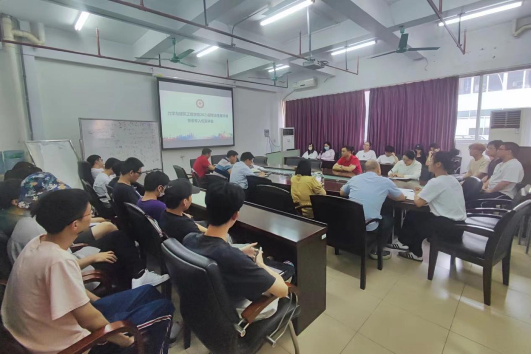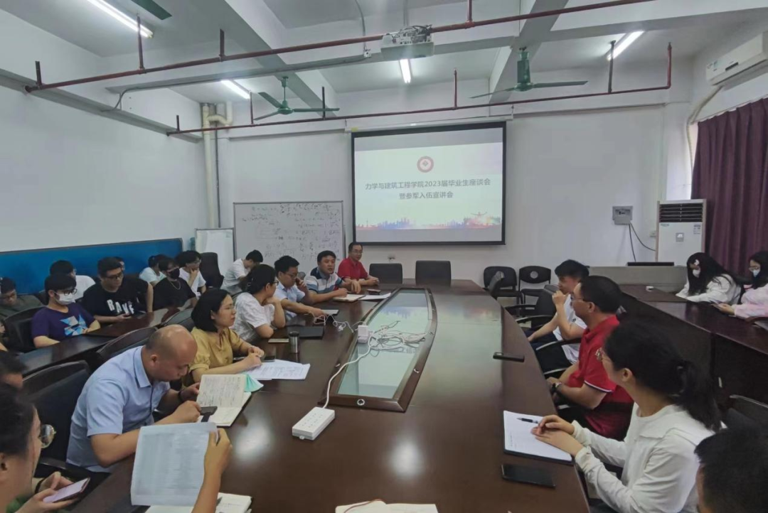 为抢抓毕业生就业工作关键期,切实加快工作进度,全力促进学院毕业生顺利就业,5月30日下午,bat365在线平台登录在蒙民伟理工楼召开2023届毕业生座谈会暨征兵宣讲会。会议邀请bat365在线平台登录武装部军事科科长彭望龙、军事科老师吴双玲莅临开展征兵宣讲。bat365在线平台登录党委副书记兼副院长黄世清,学院党委委员、办公室主任王波,学院党委委员、2019级土木工程班主任吴起星,土木工程系主任欧妍君,建筑学系主任李洁,力学系副主任章杰,土木工程系副主任、2019级工程力学班主任曾岚,建筑学系副主任、2018级建筑学班主任陈全荣,本科生辅导员薄冬营、陈婉纯,学院退伍学生代表杨振霖和2023届毕业生代表参加座谈会。会议由王波主持。