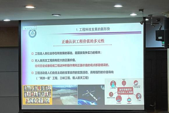 黄世清首先从工程科技发展的新形势出发,强调了回顾研究历史、认清发展形势的重要性,并通过举例我国近五年的重大成就——航空航天高铁桥梁等技术的蓬勃发展,指出做科学研究需培养前沿性思维。他还从经济、政治、军事等多方面进行分析,让学生正确认识工程价值的多元性。