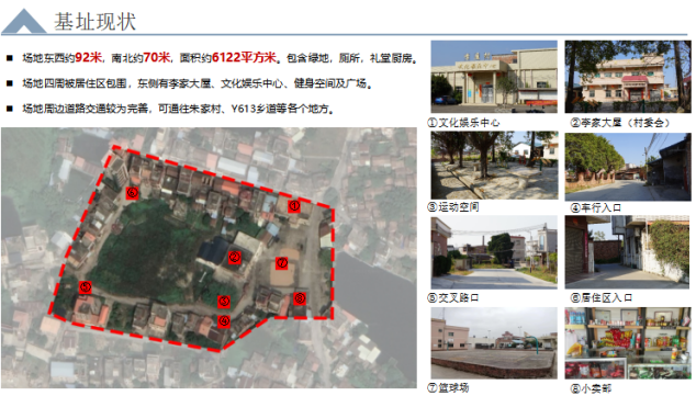 源头李屋村,位于惠州市博罗县石湾镇的东南部,设计用地位于李屋村中的文化娱乐中心附近,为当地居民户外活动的主要场所。然而当地居民的室外活动较少,缺少适宜的公共空间,且周边建筑风貌差异大,乡村风貌较为无序现象,削弱了传统地域特色与文化内涵。呈现出当地存在乡村公共文化建设不足以及文脉断裂的问题。